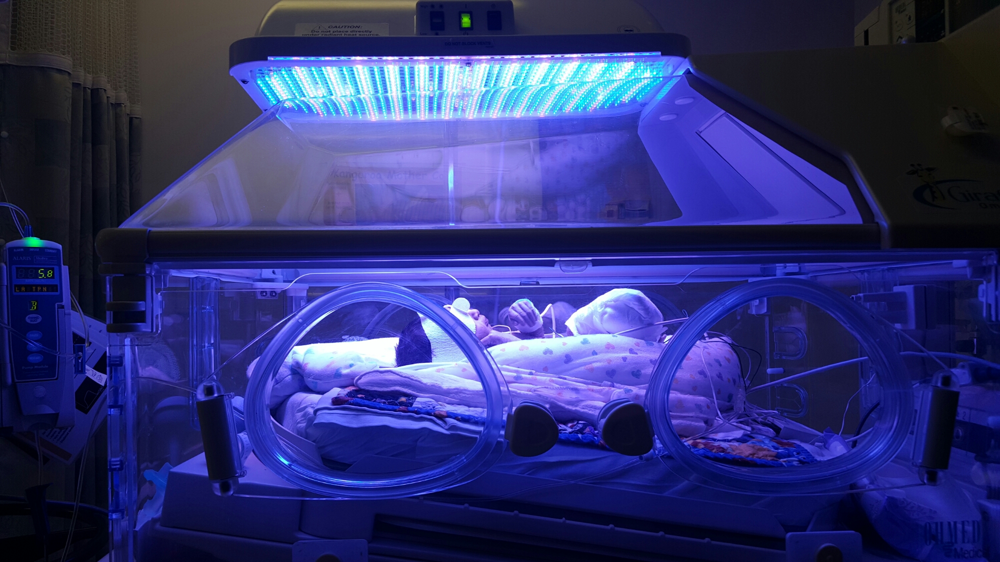 Right now you have a light on you to help with your red or white blood cells and got a little zorro mask on you to protect your little eyes. You don’t like the mask and are moving so much that the mask falls down and it covers your little baby face.