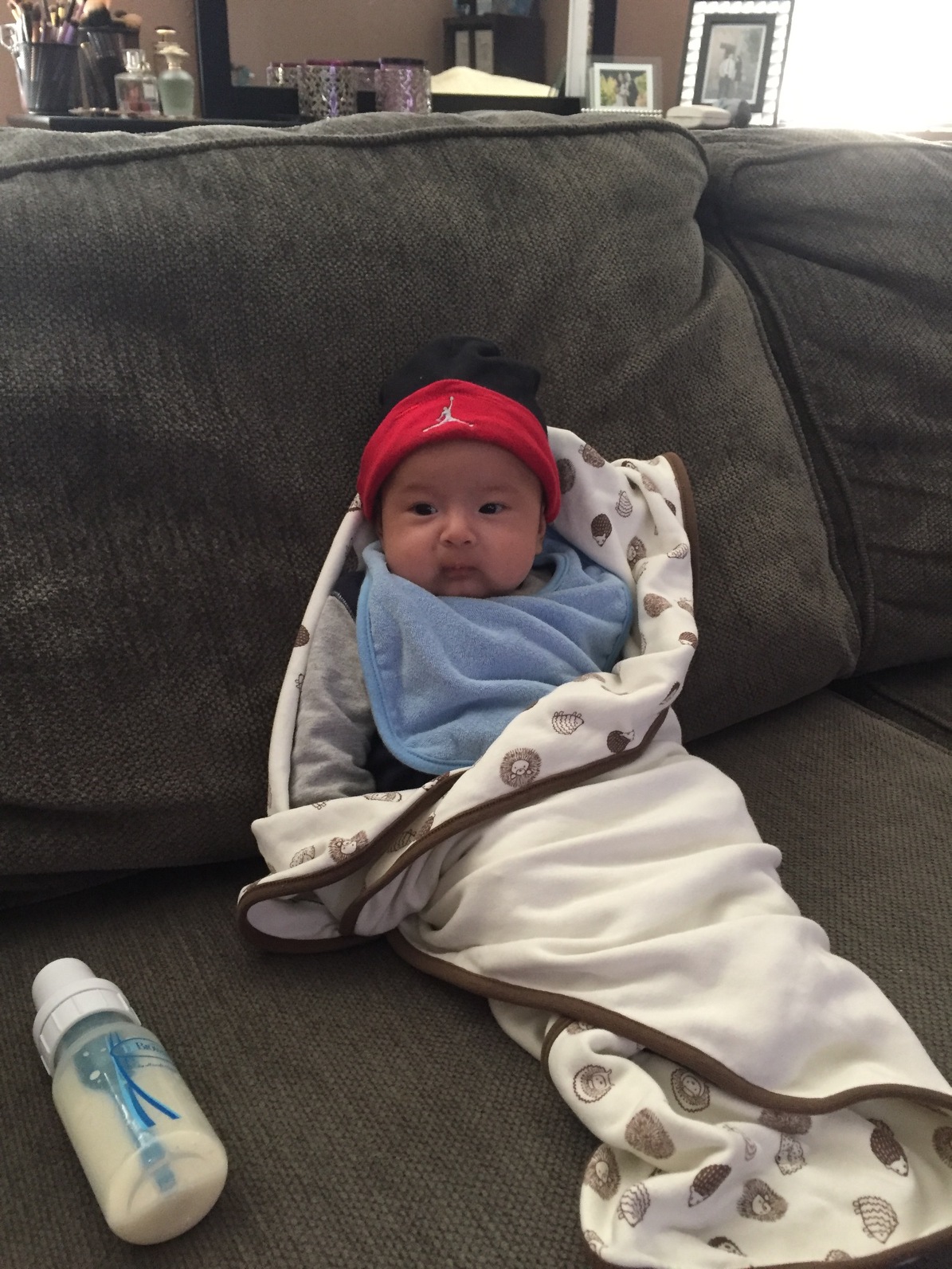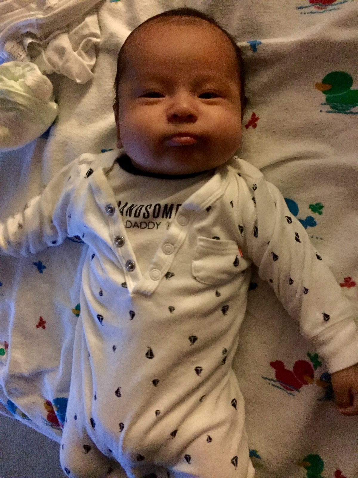 It’s Tuesday night around 10:45 pm. I’m waiting for you to wake up so that I can feed you. Mama is sleeping next to you in our bed. I didn’t want you to sleep with us in the beginning but that changed the first night you came home, don’t get used to it because I will kick your butt to your room 😉 I prolly won’t but don’t get too used to it.